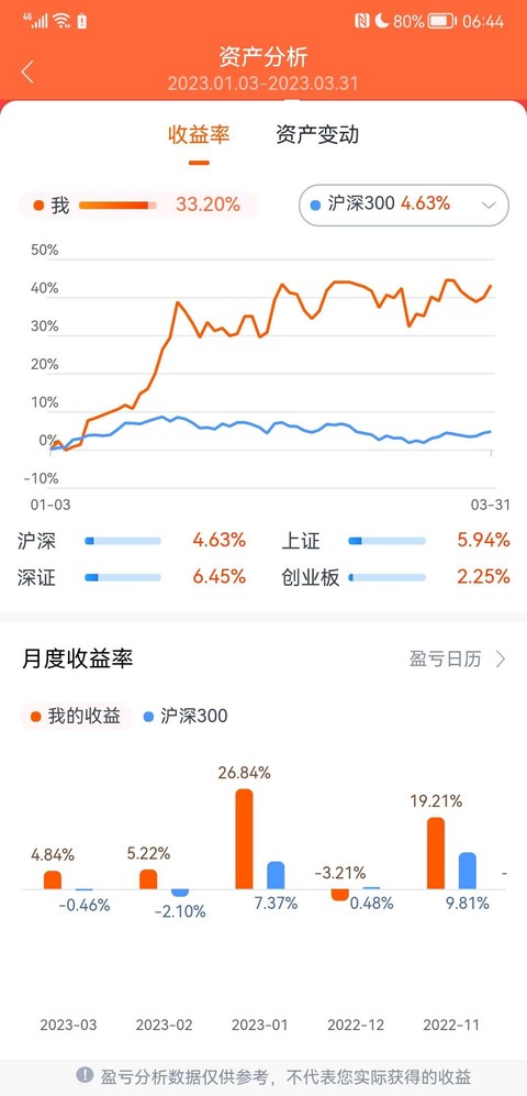 一季度收益率,还不错。就是不能玩儿木匠活了,天天盯盘。另外,软件提供的收益率与图上不一致,我不知道为什么,我自己按数算出的也比这个稍高,大概参考吧。