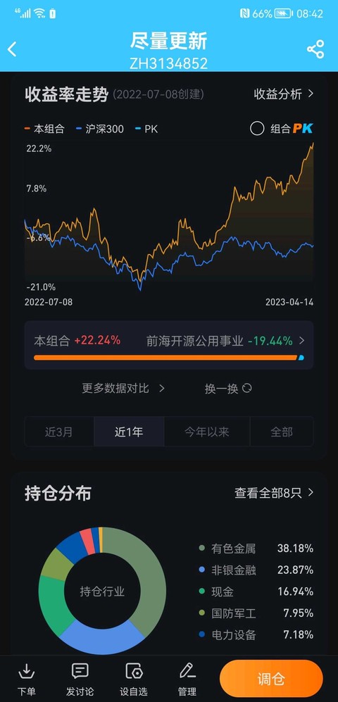从去年7月8日开始,我的组合收益是22%,这期间各大指数处于微跌或微涨状态。我特别要说的是,这期间的投资标的既没有白马,也没有赛道,也没有炙手可热的GPT。我投资的都是令人乏味的标的,有色金属,卷商,央企,也有银行,地产,医药(亏很多)。有人经常在评论区里批评我的标的是织布机,他们更喜欢一日上涨20甚至30,但我真的不知道有谁这么做会连续成功了。